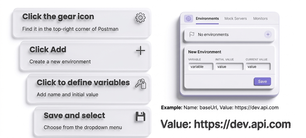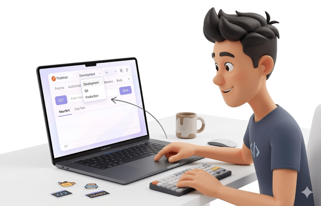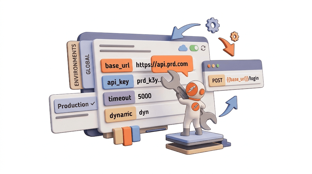 In Postman, environments store variables (URLs, tokens, credentials)