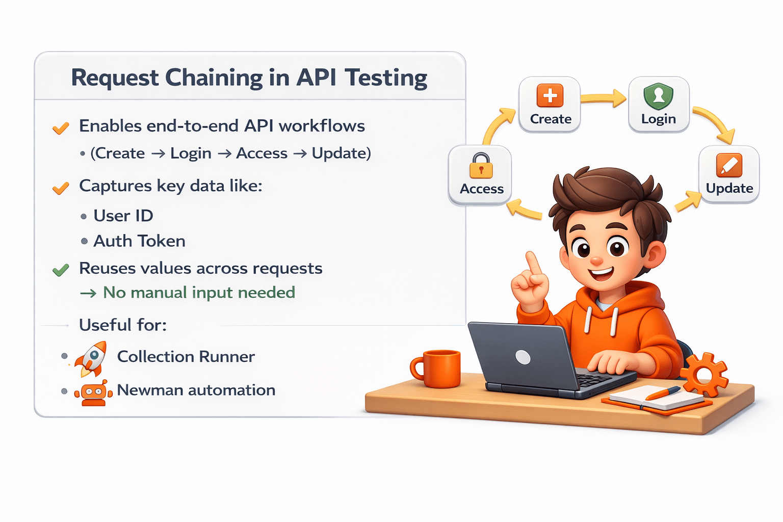 API request chaining is a technique where the output of one API request is used as an input for another request and  storing them in variables.